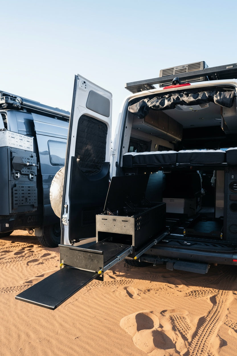 A built-in tray sized for a Coleman cooktop (not included) and a slide-out prep table tray make this an essential addition for van kitchens, compatible with all van models with L-Track in the garage.