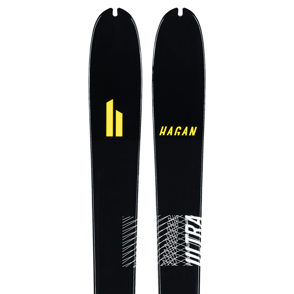 The Hagan ULTRA Series is dedicated to lightness and speed, while maintaining reliability in challenging and technical terrain. The ULTRA Series has been engineered, to create skis with better durability and downhill performance, while still shedding weight. With a double "prepack" foil made of a fiberglass and carbon mixture, in addition to a continuous top layer of carbon, we have achieved just that: even lighter skis that have improved reliability, stability and durability. No stone has been left unturned, as we even changed the composition of our top coat to a glossy finish in order to help reduce weight.